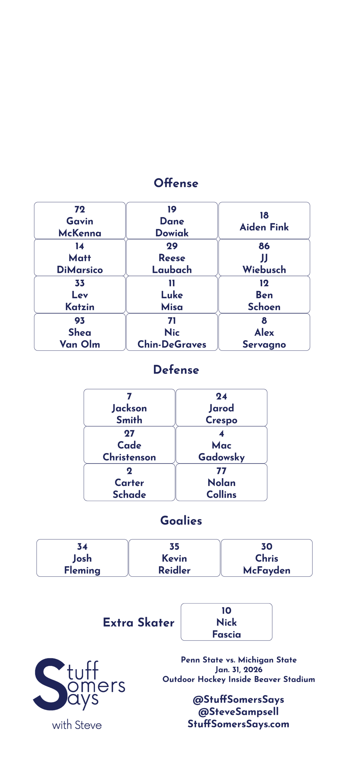To get you ready for the men’s game, here are some printable and phone screen line charts. There is still a game to be played between when this is posted and the Beaver Stadium game. The line charts are also built off of last weekend’s line charts. All of that is to say that things can change. We also don’t know who will be the starting goalie for Saturday’s contest but have listed Josh Fleming first because he has a higher save percentage.