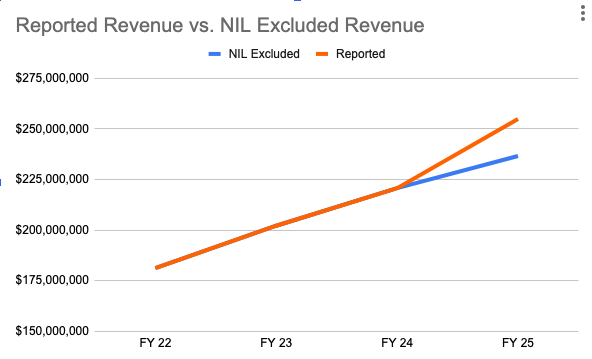 However, with the NIL contributions removed, Penn State would have generated $236 million in total revenue, meaning that FY25 saw a just 7 percent increase in revenue instead of the 15 percent reported.