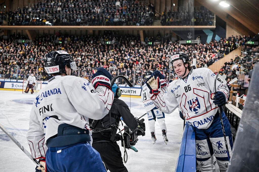U.S. Collegiate Selects’ JJ Wiebusch celebrates with teammate Aiden Fink durring the Spengler Cup ice hockey tournament in Davos, Switzerland, on Saturday, December 27, 2025. (KEYSTONE/Melanie Duchene)